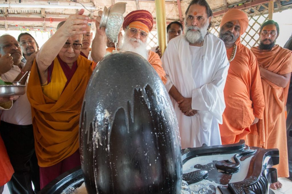 Here taking part in the worship of the Shiva Lingam. Source: DalaiLama.com
