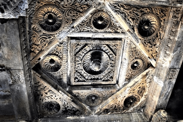 In existing, operational Saivite temples in India we find more or less the same type of ceiling carvings, both extruding and pertruding are common. Notice the eight points around the center:
